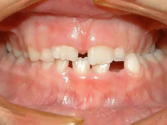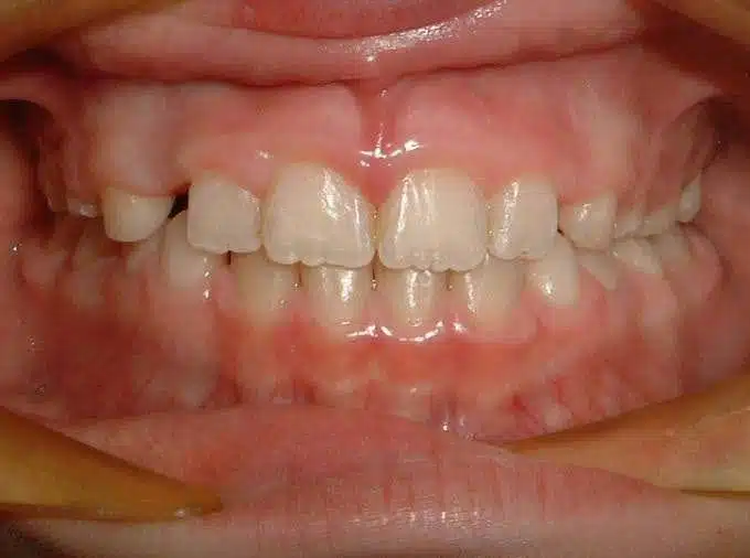 In some kids, the upper permanent front teeth will space out as their erupt. This can present a problem for the eruption of oher teeth since they will take some of the space needed for other teeth. Treatment sometimes is needed early to provide the proper spacing for the remaining teeth. Treatment length: 10 months.