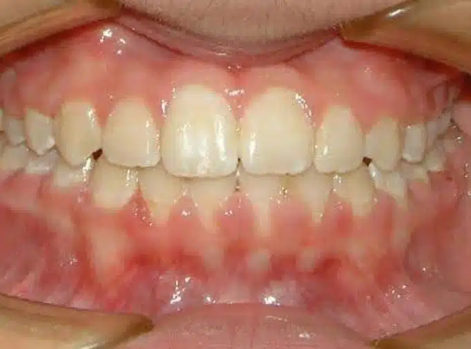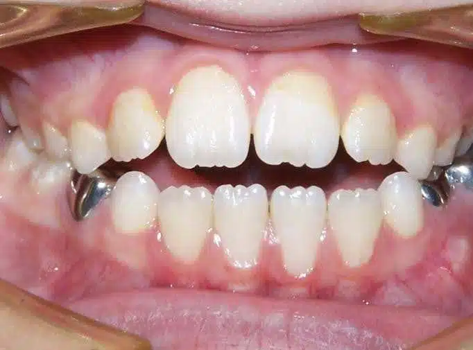 The presence of an under bite (upper teeth inside the lower teeth) is a very serious problem in a child. Prolonged function in the under bite position can hinder the development of the upper jaw during growth. Future surgical correction might be required if the problem is not addressed in time. Length of treatment: 12 months.
