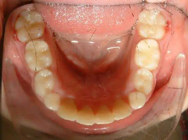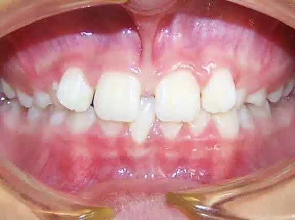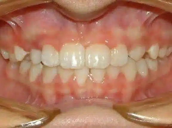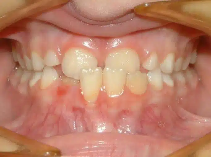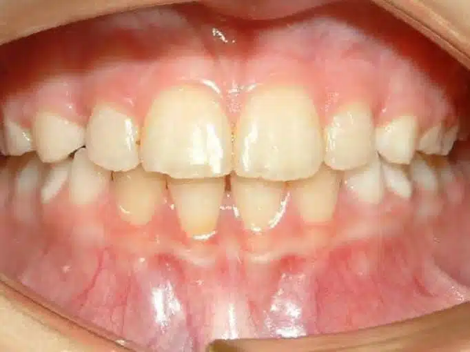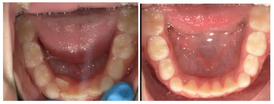 The presence of an under bite (upper teeth inside the lower teeth) is a very serious problem in a child. Prolonged function in the under bite position can hinder the development of the upper jaw during growth. Future surgical correction might be required if the problem is not addressed in time. Length of treatment: 12 months.