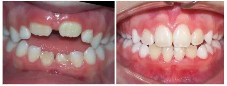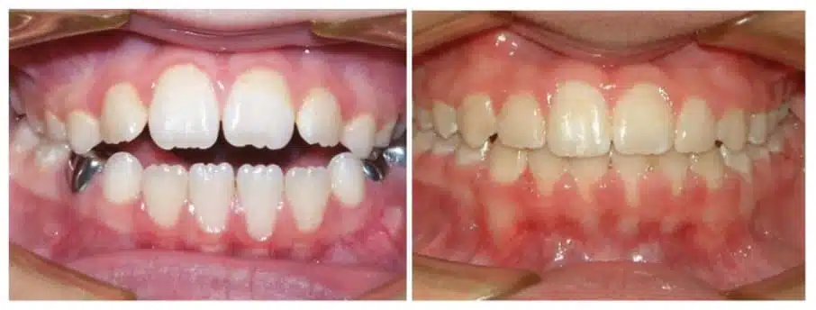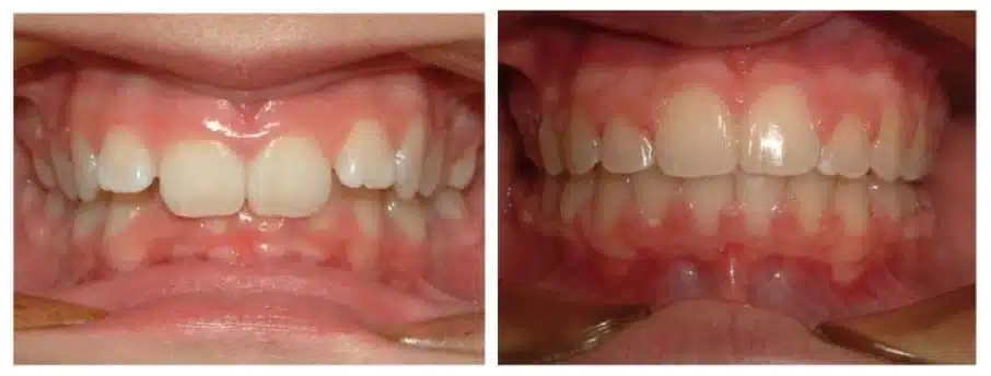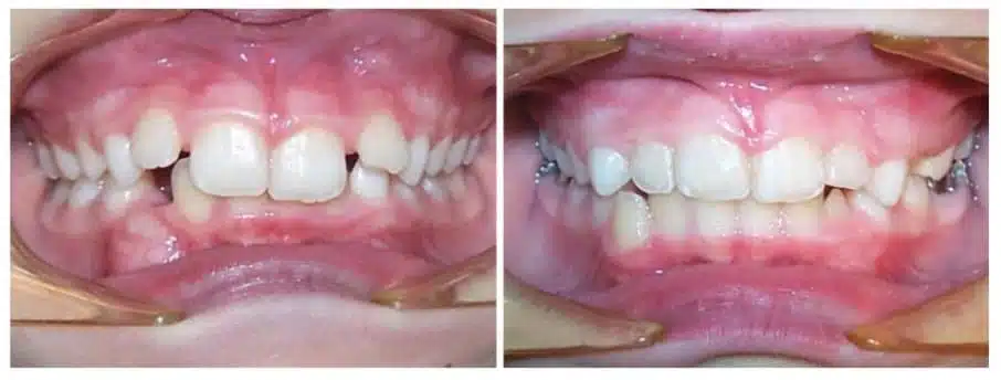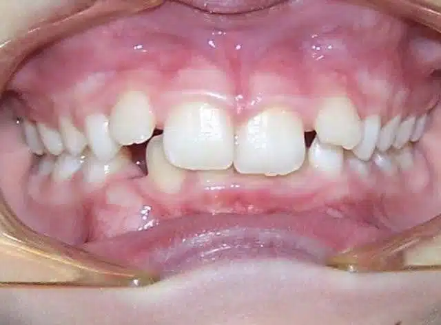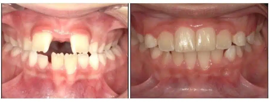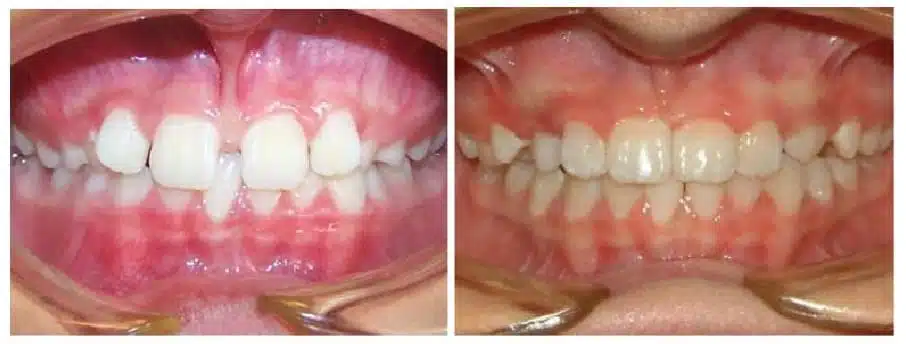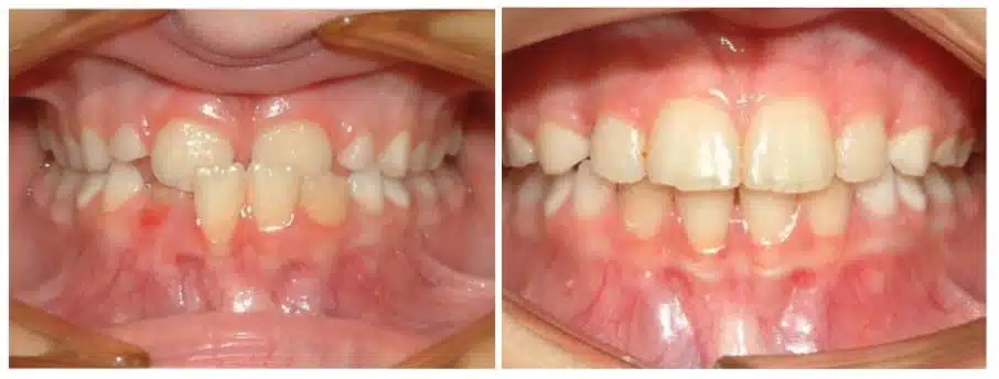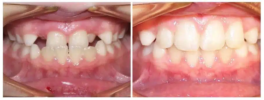 In some kids, the upper permanent front teeth will space out as their erupt. This can present a problem for the eruption of oher teeth since they will take some of the space needed for other teeth. Treatment sometimes is needed early to provide the proper spacing for the remaining teeth. Treatment length: 10 months.